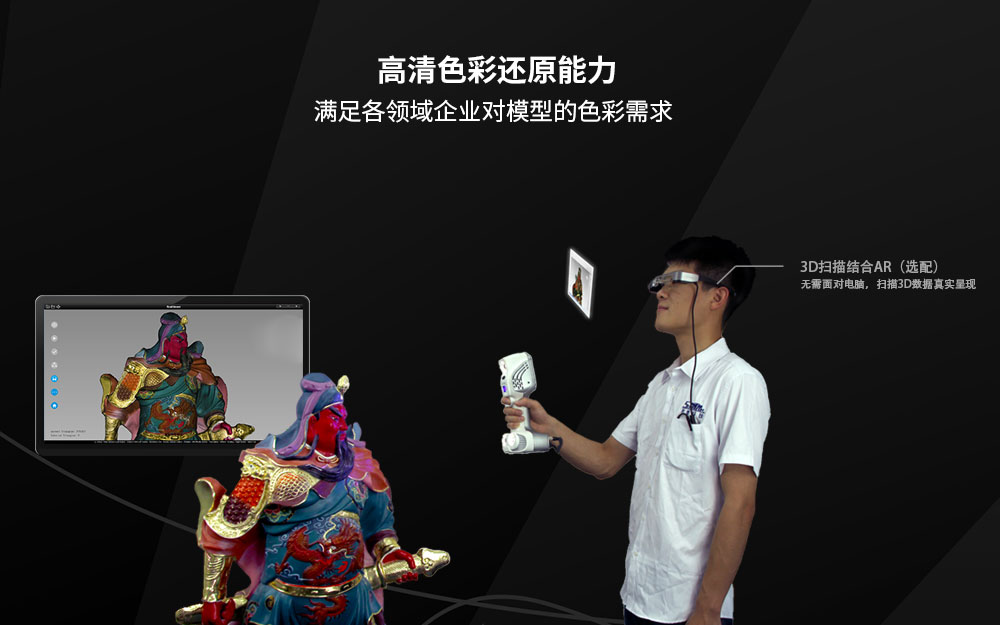 強(qiáng)大的拼接能力:擁有先進(jìn)的紋理拼接和幾何特征拼接算法,當(dāng)用戶遇到連續(xù)不規(guī)則的圖案/幾何特征變化的物品時,無需貼點(diǎn)即可完成掃描。當(dāng)遇到復(fù)雜特征物品時(存在無特征區(qū)域易于拼錯),使用混合拼接(將紋理、特征、標(biāo)記點(diǎn)拼接智能地融合在一起),只需貼少量標(biāo)記點(diǎn)即可完成掃描。